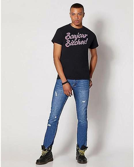 Pardon my French. What’s up, bitches? This bold black and pink “bonjour bitches” t shirt offers a warm greeting that’s bound to turn heads wherever you go.