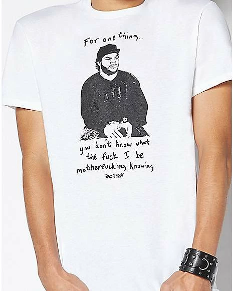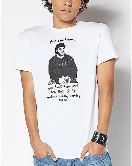 Rock a classic movie quote with thisΒ Boyz in the Hood T Shirt! This white tee graphic feature the quote “For one thing…you don’t know what the fuck I be motherfucking knowing.” If that ain’t boss, we know know what is.