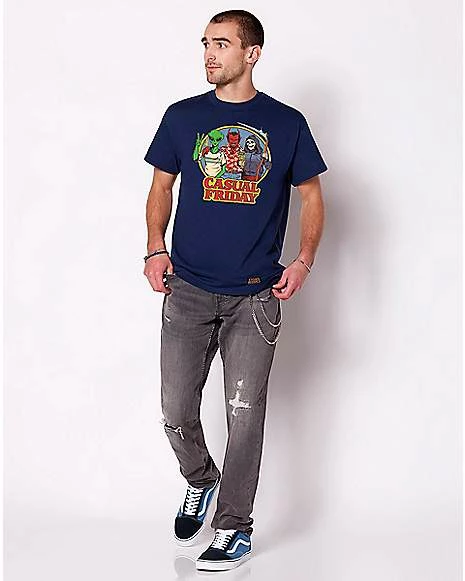 Add some humor to your look just in time for casual Friday with this officially licensed Casual Friday T Shirt. This stylish t shirt from the Steven Rhodes collection feature an alien, devil, and grim reaper on the front ready for just another casual Friday at the office.