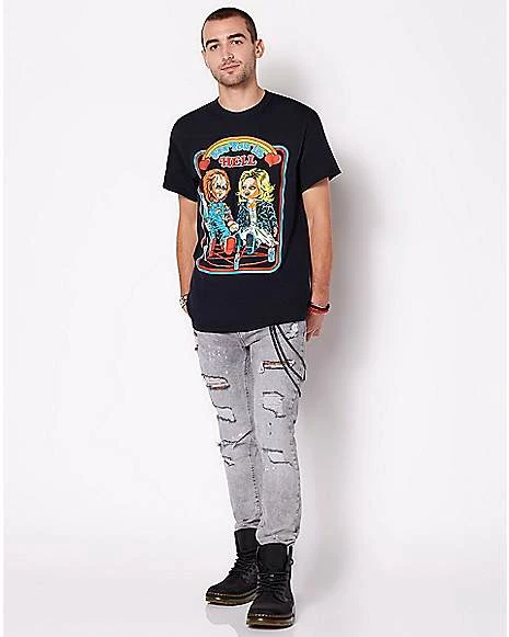 There’s no better way to show your fandom for horror’s power couple than with this officially licensed See You in Hell T Shirt. This vintage style t shirt features Chucky and Tiffany on the front and will make an awesome and creepy addition to your t shirt collection.ย