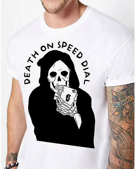 Kick your Halloween style up a notch in this Death on Speed Dial T Shirt! If you’ve got a need for speed and a lust for danger, this black and white graphic tee was made for you. Pair it with your favorite jeans and a black leather jacket for a bad to the bone look that’s too good to pass up.