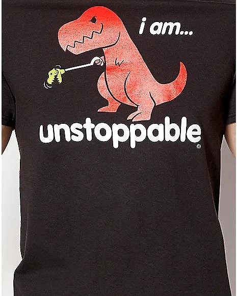 Add some humor to your wardrobe with this Dinosaur I Am Unstoppable T Shirt! This black tee features a red dinosaur picking up a set of keys.