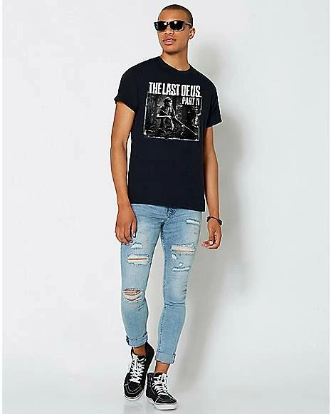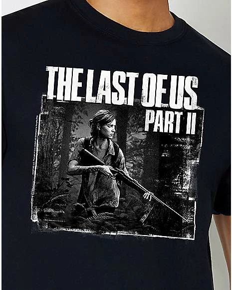 Honor your favorite game in this official The Last of Us Part II Ellie t shirt! Featuring Ellie in the woods holding a long gun, this graphic tee is perfect for any fan.