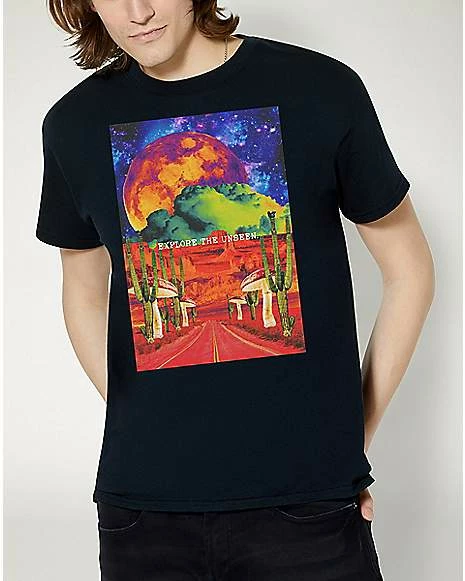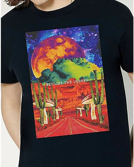 Looking to add some groovy new style to your wardrobe? Embrace your inner hippie when you rock this Explore the Unseen T Shirt. This colorful top is sure to add a psychedelic element to your look!