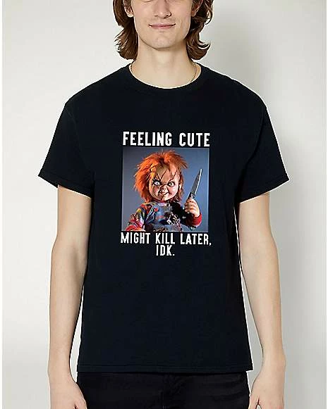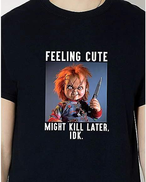 Show your love for your favorite horror icon with this Feeling Cute Chucky T Shirt! This officially licensed tee, which features Chucky clutching a knife, will add the perfect touch of slasher style to your look.
