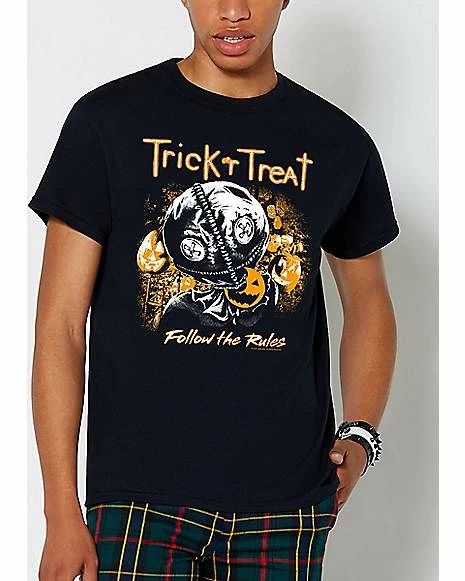 Style up with Sam by your side with this terrifying Trick ‘r Treat tee! This officially licensed tee, which features a horrifying stylized portrait of Sam, will encourage everyone to remember the rules of Halloween… or else.