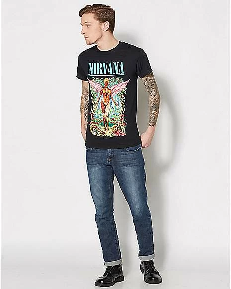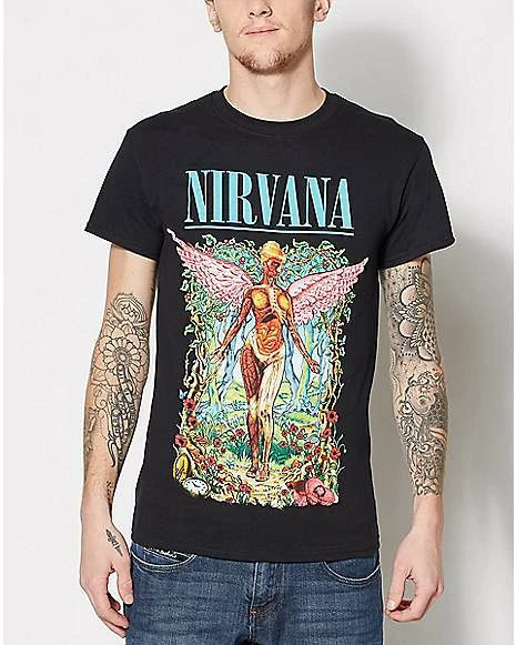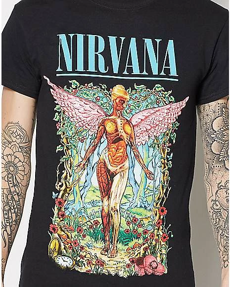 Rock to your favorite band while you rock this awesome Nirvana t shirt! Featuring the winged character from the cover of In Utero surrounded by a flowering forest, this shirt is a must-have for any Nirvana fan.
