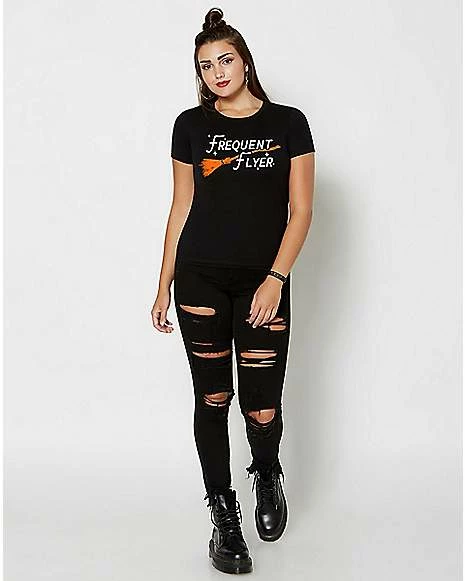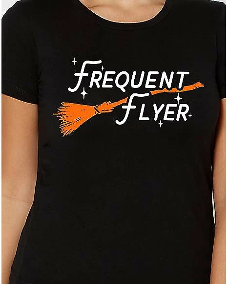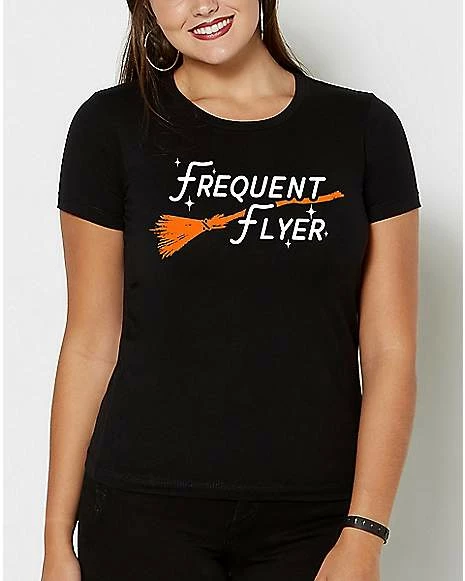 Grab your broomstick and get ready to ride! This Frequent Flyer T Shirt makes a wicked stylish addition to your witchy wardrobe. Adorned with bold white lettering and a sleek orange broomstick, this tee is perfect for Halloween.