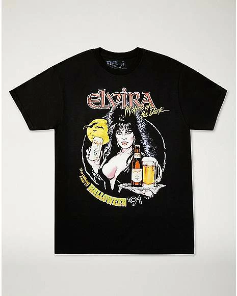 Add a touch of tantalizing style to your wardrobe with this Fright Light Elvira T Shirt! This officially licensed tee features Elvira, Mistress of the Dark, holding some Fright Light beverages. This classic tee is sure to please any fan of theย Elvira’s Movie Macabreย series from the ’80s!