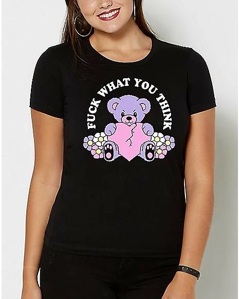 Teddy doesn’t give a fuck what you think. This black graphic tee features a cuddly bear surrounded by pastel flowers and a bold message!