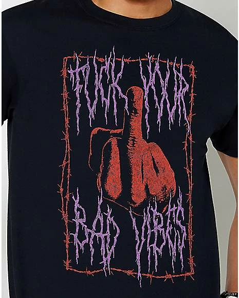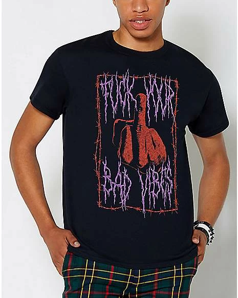Throw up a middle finger to the haters when you rock the Fuck Your Bad Vibes T Shirt! Hopefully whoever brought the bad vibes will take the hint…