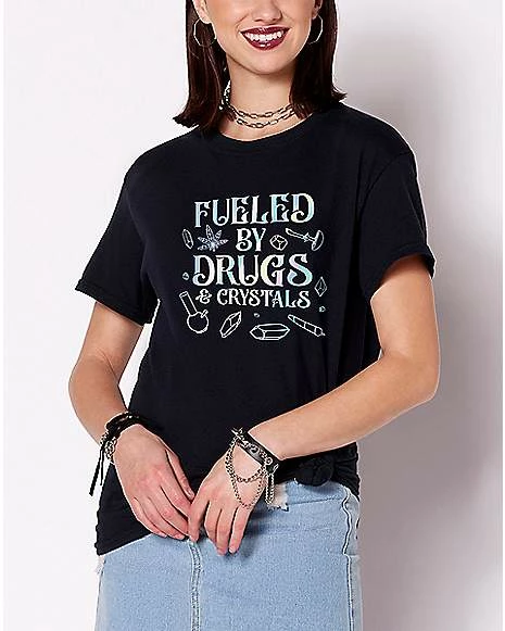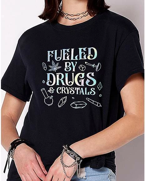 Make everyone laugh when you rock this Fueled By Drugs and Crystals t shirt! This attention-getting graphic tee is a perfect conversation starter.