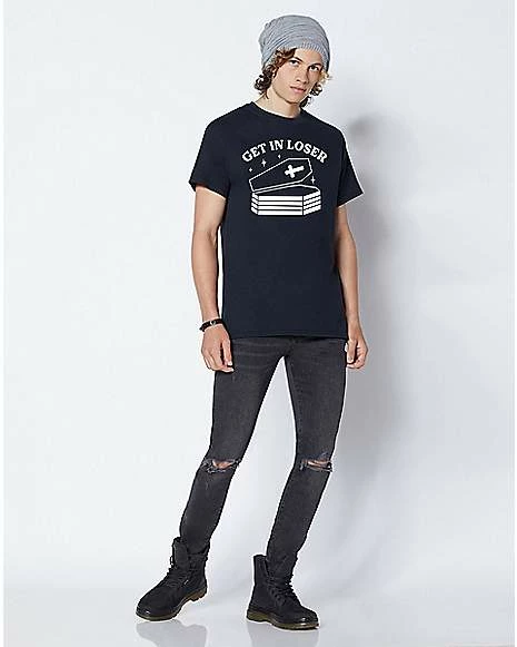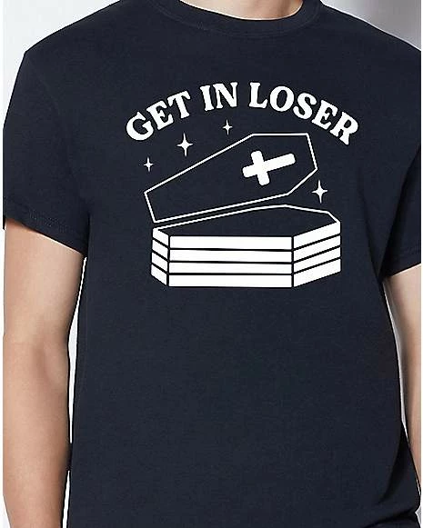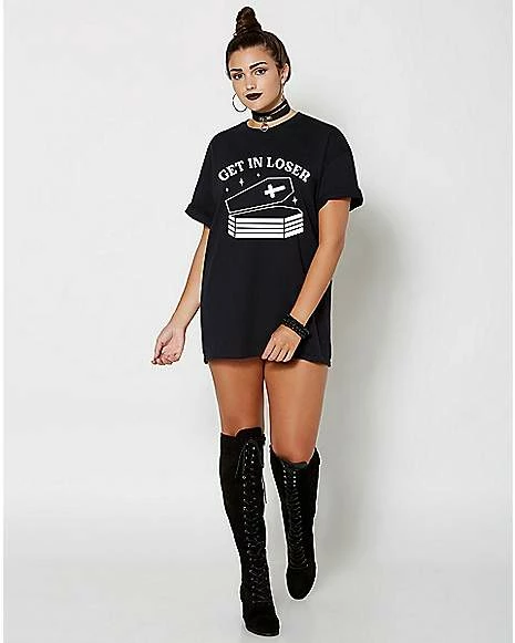 Get in, loser. We’re going coffin hopping! This funny t shirt is a Halloween must-have. Wear this sinister style as a fitted tee, or try it on in 3-4 sizes up from your normal size as a t shirt dress! Rock it loose or belted with your favorite boots and you’ll be ready for whatever the night has in store for you.