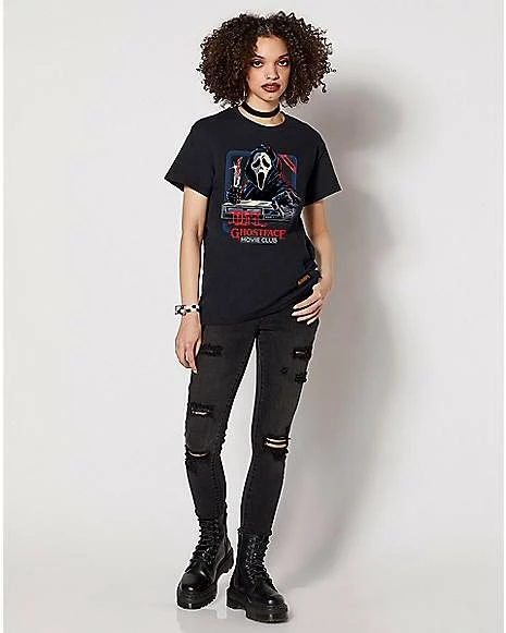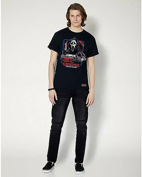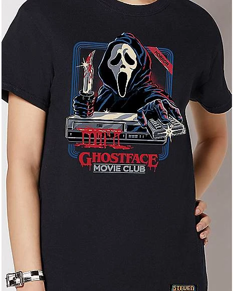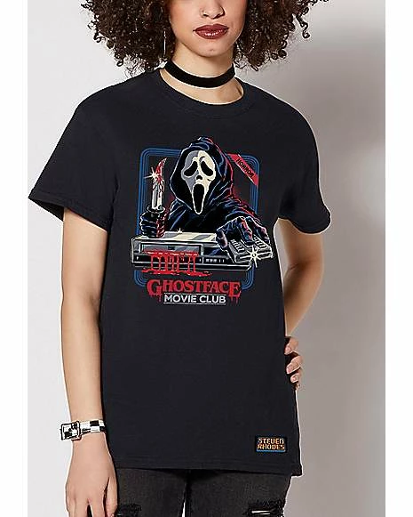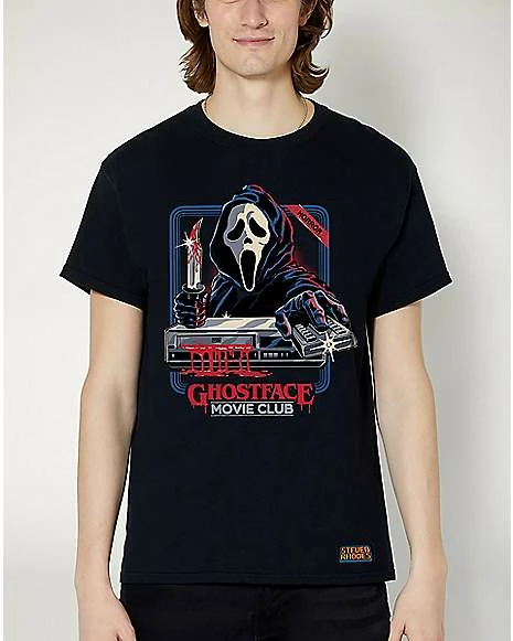 Add a fresh new horrifying look to your casual outfit by adding this Ghost Face® Movie Club t shirt to your casual wardrobe. This awesome tee features the work of Steven Rhodes and is a comfortable choice to rock to show off your fandom for your favorite horror movie killer.