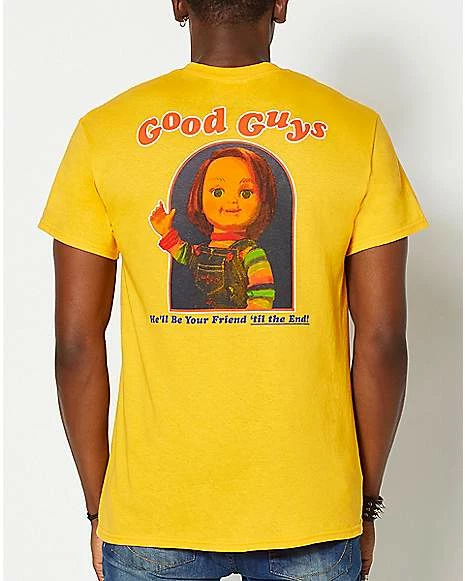 Once you add this officially licensed Good Guys Chucky T Shirt to your collection everyone will know you’re a fan of classic horror movies. This officially licensed tee features your “friend til the end” Chucky on the front and back and will add some killer style to your casual wardrobe.ย