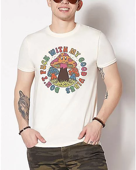 Let the world know that nobody can mess with your good vibes when you rock this tee! This groovy shirt features images of cute and colorful magic mushroom. Trippy!