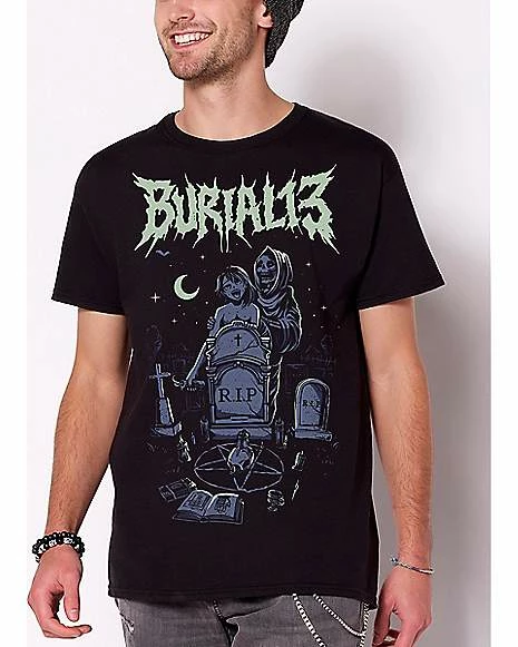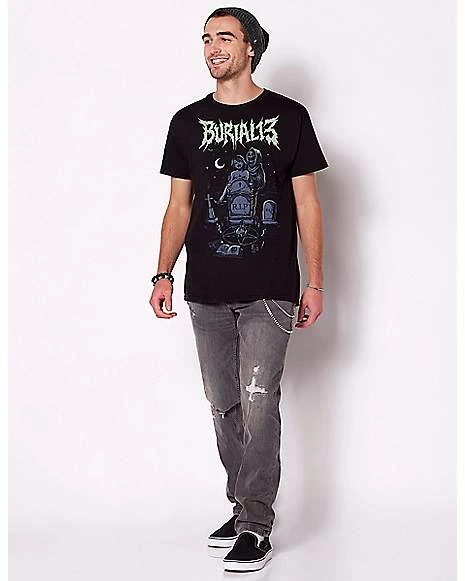 Add some fresh style to your wardrobe when you get this officially licensed Graveyard Baby T Shirt by Burial 13. This tee has an incredible design that features an image of the Grim Reaper hiding out in a cemetery with his sidekick.
