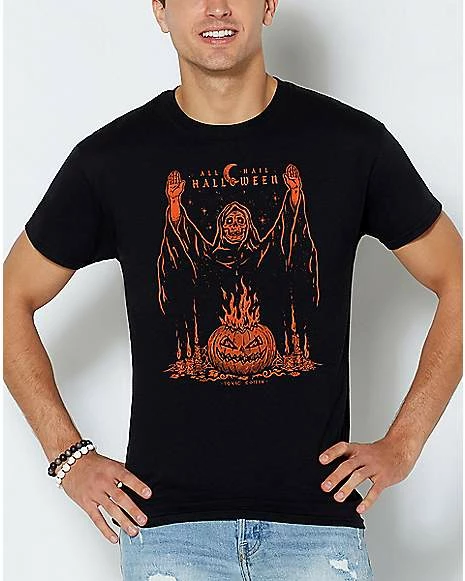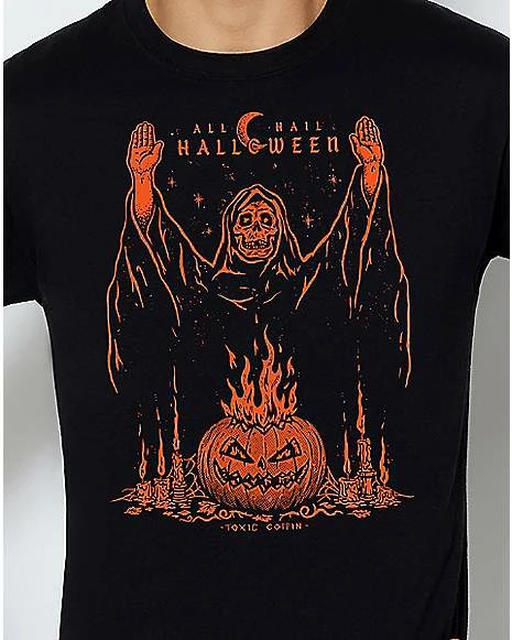 Embrace your dark side with this skeleton-emblazoned Hail Halloween t shirt! This horror-tinged graphic tee is the perfect addition to your everyday wardrobe.
