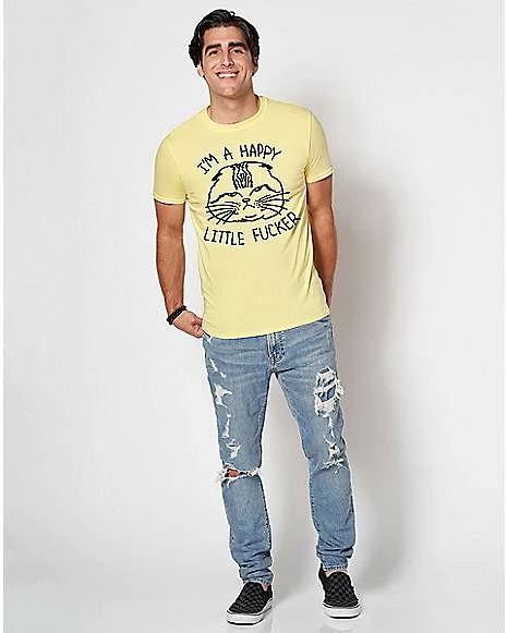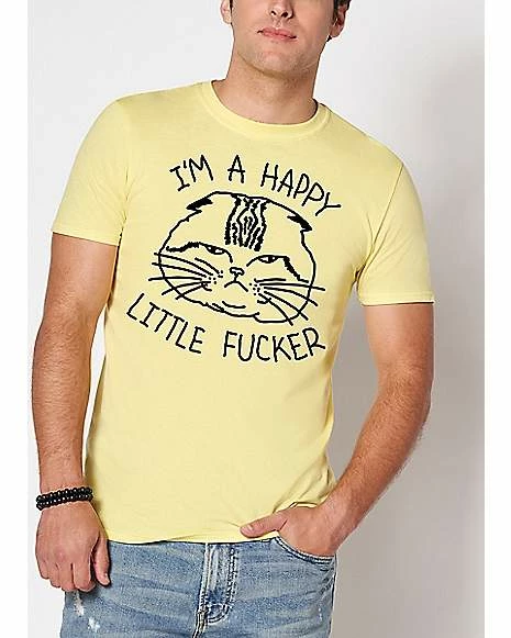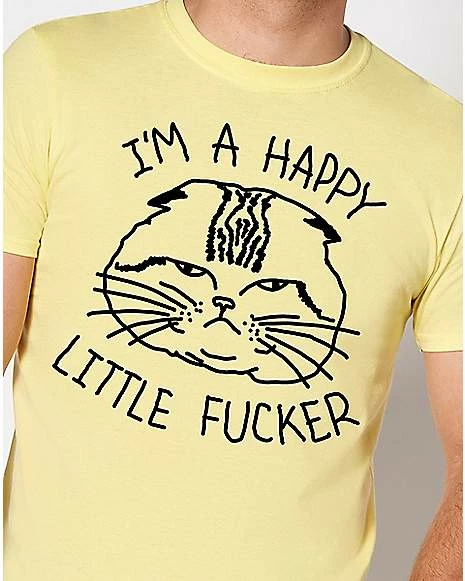 Show off your sunny disposition with this Happy Little Fucker T Shirt! This tee, which features a simple design of an angry cat and the phrase “I’m a happy little fucker,” is a perfect addition to any wardrobe. Make a statement with this hilarious tee!