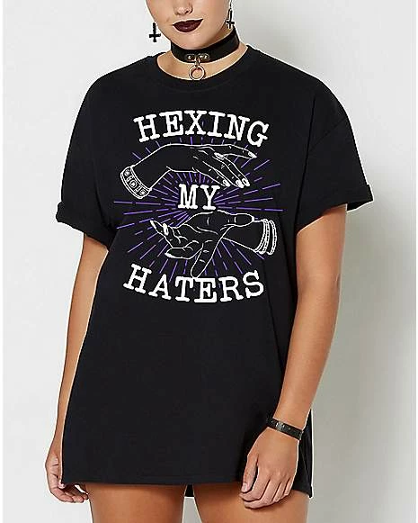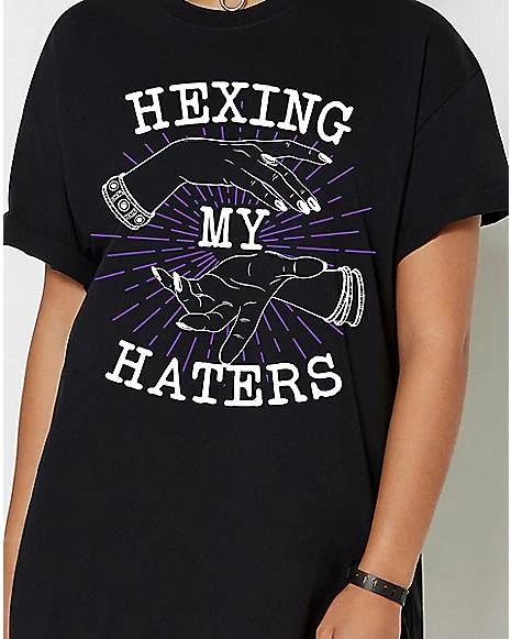 Halloween is the best time for carving pumpkins, eating candy, and most importantly, hexing your haters. Cast out all bad vibes in this Hexing My Haters T Shirt! Wear this spellbinding tee in your normal size for a fitted look, or order it 3-4 sizes up to wear it as a cool and casual t shirt dress.