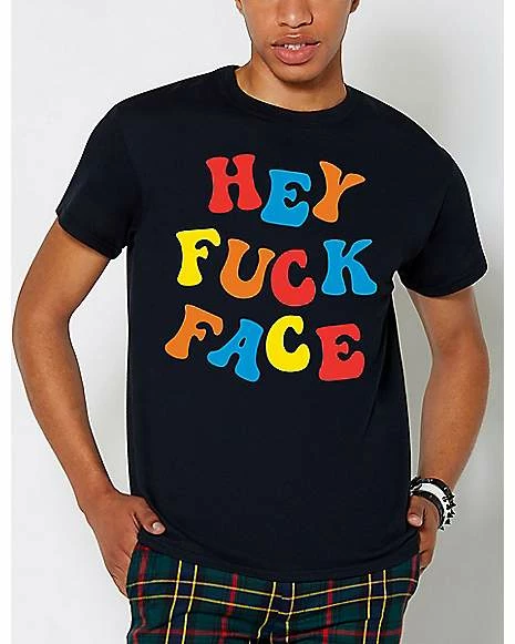 Show off your attitude when you hit the town rocking this Hey Fuck Face T Shirt. This stylish tee is a hilarious way to add some personality to any casual look and is sure to get some attention.