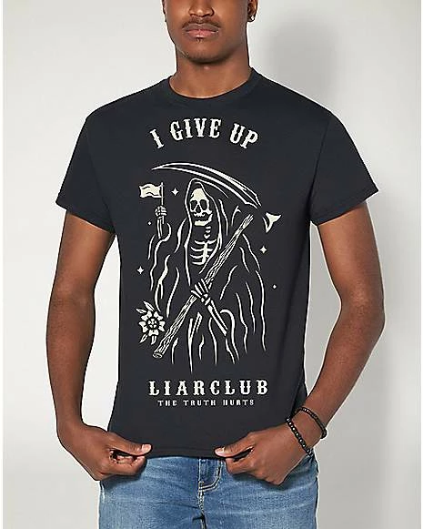 Looking for a top that’s both funny and stylish? We’ve got the perfect tee for you. The I Give Up T Shirt is designed by Liar Club and features an image of the Grim Reaper waving the white flag.ย
