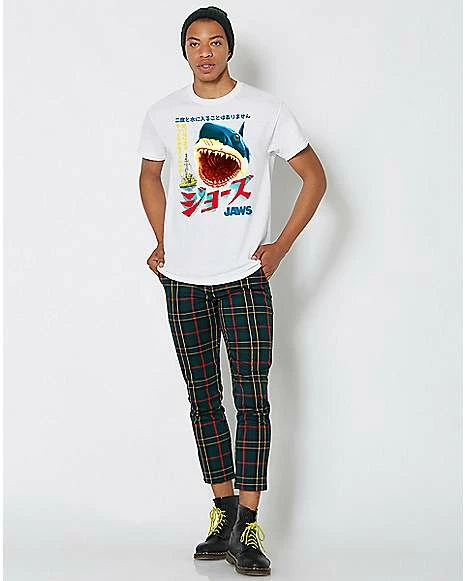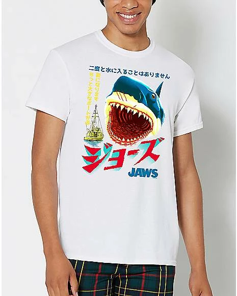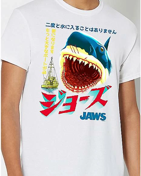 Everyone will know you’re a total thrill seeker when you wear this Japanese Jaws Poster T Shirt. This cool tee features a giant Shark on the front that’s perfect for fans of the original film or other shark enthusiasts. You’ll b looking sweet this shark week with this Jaws t shirt on.ย