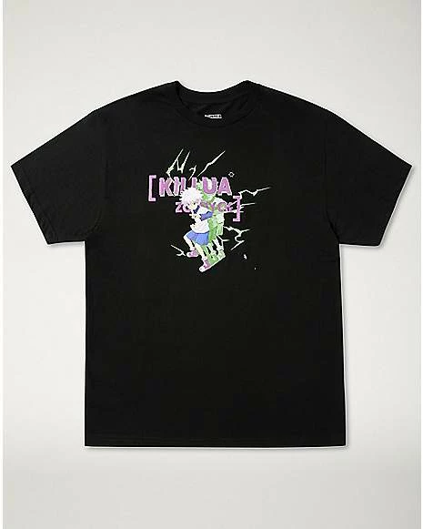 Show off your Hunter x Hunter fandom when you put on this Killua Zoldyck t shirt! This stylish black graphic tee is the perfect way to add some anime style to your casual wardrobe.