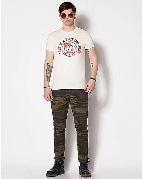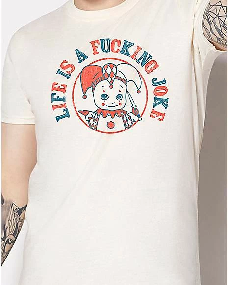 Stop taking life so seriously! Get yourself this hilarious tee and show off your carefree perspective! It features an image of a clown and the phrase, “Life is a fucking joke.”