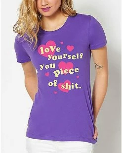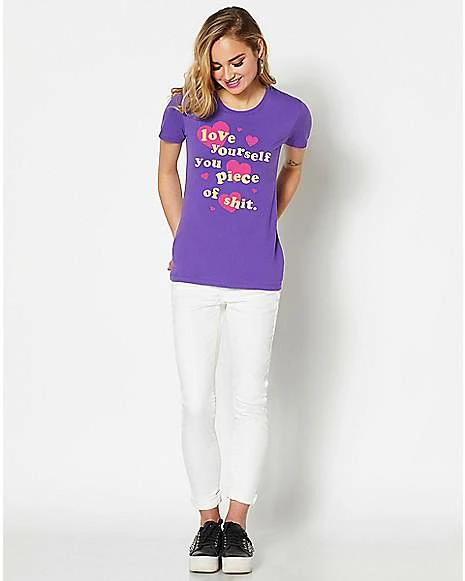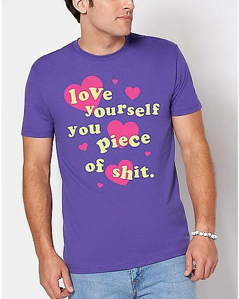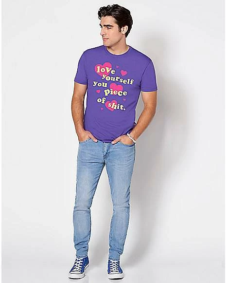Put a humorous spin on loving yourself with this graphic tee! This funny t shirt, which says “Love yourself you piece of shit,” will make anyone who reads it smile and is a perfect pick-me-up whenever you need a boost.