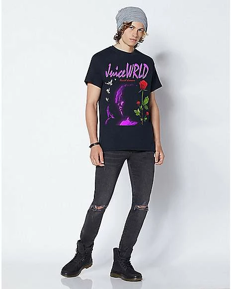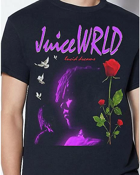 Get ready to have some lucid dreams of your own when you pick up this officially licensed Lucid Rose Juice WRLD T Shirt. This Juice WRLD tee is a stylish way to represent the 999 Club and is perfect for showing your respect to one of hip hop’s young artists gone too soon. Show your love for Juice WRLD by rocking this tee at your next concert or music festival!