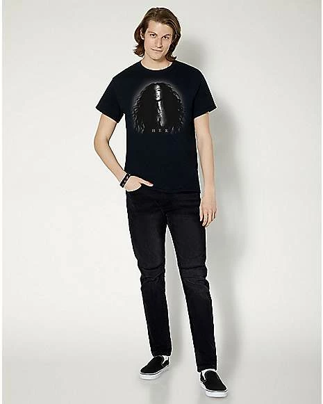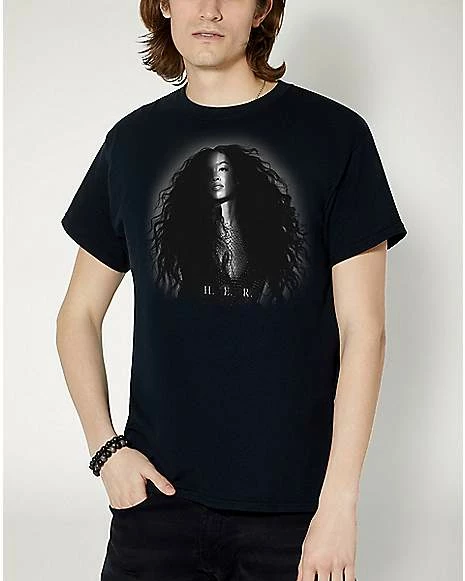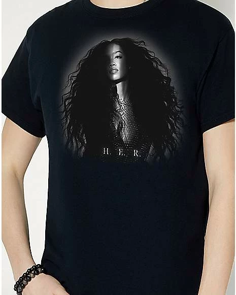 Add the perfect music style to your wardrobe with this bold H.E.R. t shirt! This black graphic tee features a photo of H.E.R. on the front and is perfect for any fan.
