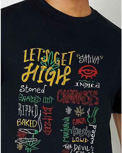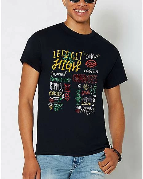 Live the high life in this trippy t shirt. Featuring an artistic display of baked buzzwords, this colorful t shirt will leave you craving something crunchy. Or maybe something cold. Or both.