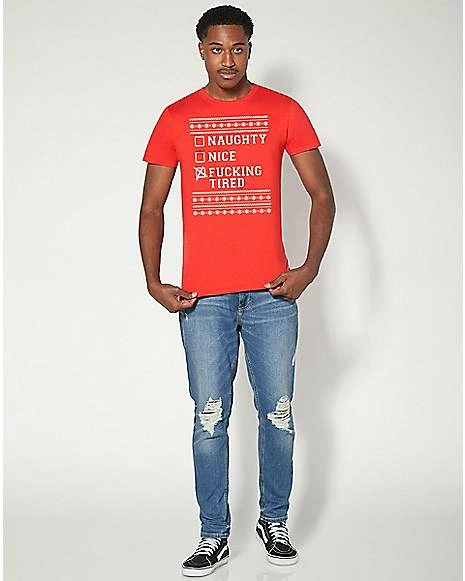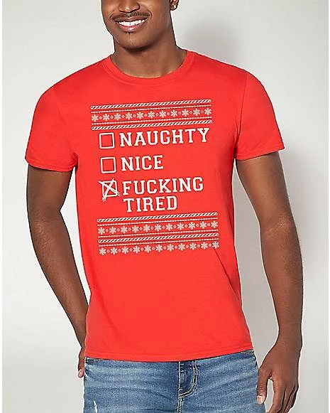 Show off your mood is tired this holiday when you hit the town rocking this Naughty Nice Tired T Shirt. This stylish tee is a great way to add some personality to any casual look and is sure to get some laughs at the holiday party.