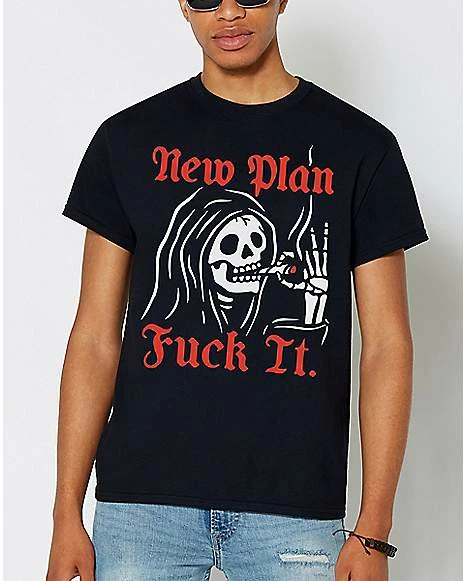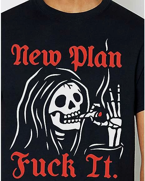 Sometimes you just have to say screw it. This shirt will make it easier to do that. The New Plan Reaper T Shirt features an image of a reaper that will look amazing on you!