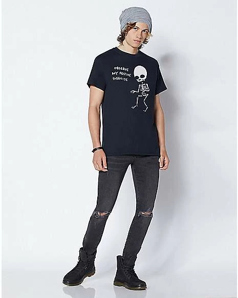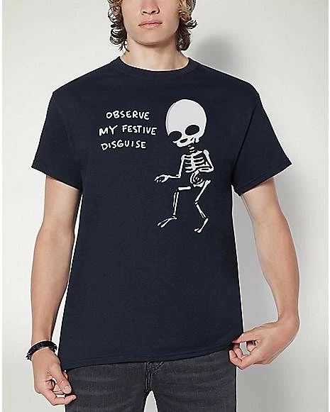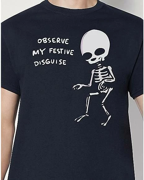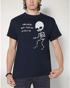 Any fan of Nathan W Pyle will be so excited to add this Observe My Festive Disguise T Shirt to your collection. This cool tee features a festive skeleton on the front ready to show off and is sure to become a go-to favorite of yours.ย