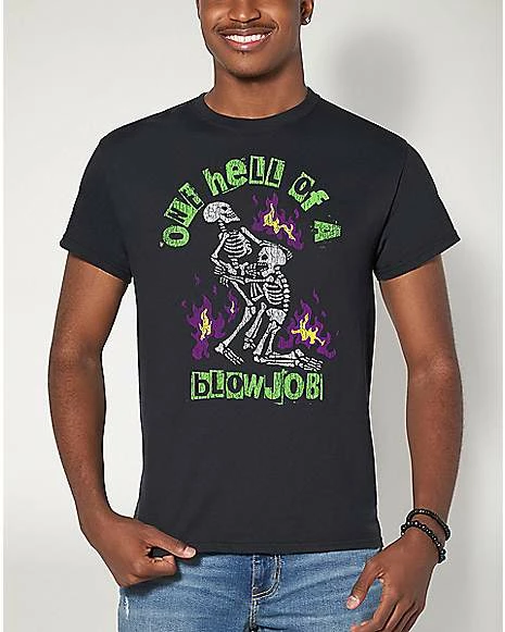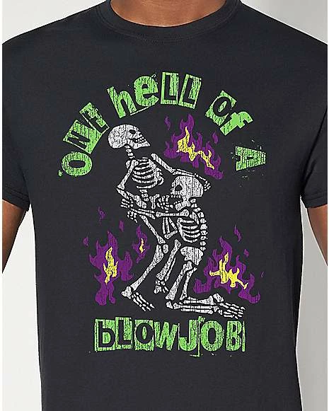 Let it blow! This “One Hell of a Blowjob” t shirt features a couple of skeletons doin’ the deed. Vibrant block print and purple flames make this graphic tee extra hot.