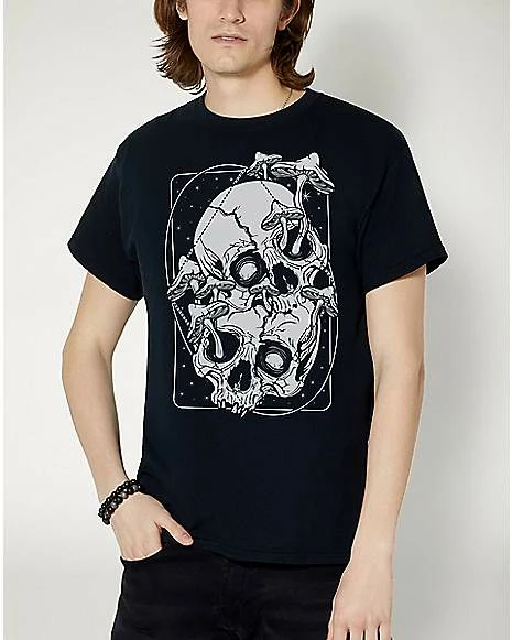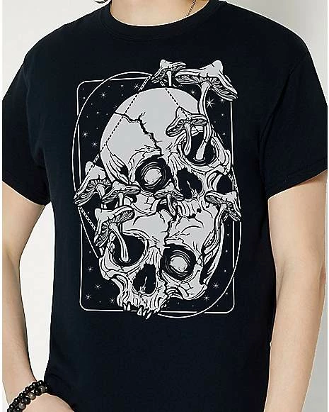 Show off your dark side with this black Overgrown t shirt by artist von Kowen! This tee features two skulls and some trippy mushrooms growing out of them. This stylish and bold look is the perfect way to capture everyone’s attention.