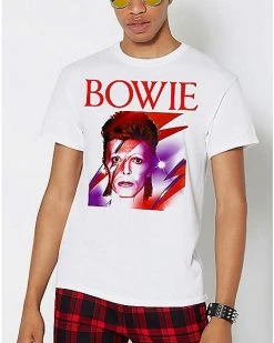 Honor one of the greatest musical artists of all time with this bold David Bowie t shirt! Featuring his unmistakable lightning bolt makeup, this graphic tee is perfect for any Bowie fan.