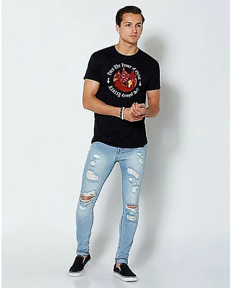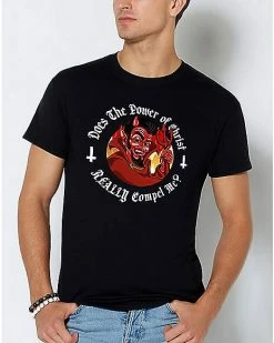 The power of Christ compels you! Or does it? Rock this devilish black graphic tee to heat up your look in an instant.