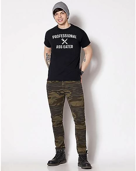 Flaunt your status as a professional ass eater in this funny black graphic tee. Featuring the text, “professional ass eater” and a fork and knife graphic, this soft tee is guaranteed to turn heads.