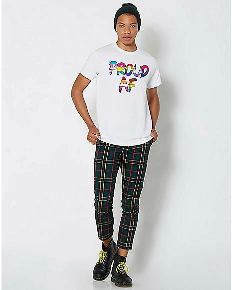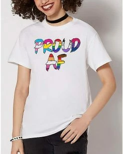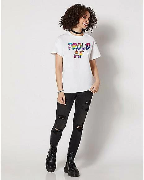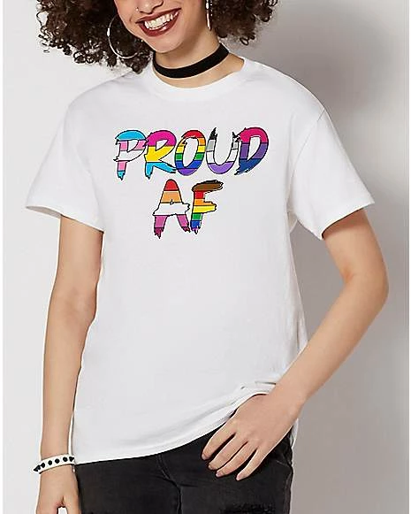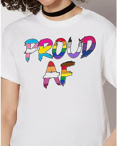 If you’re proud and you know it, stand UP! This colorful t shirt pulls colors from various pride flags into one central message: Proud AF!