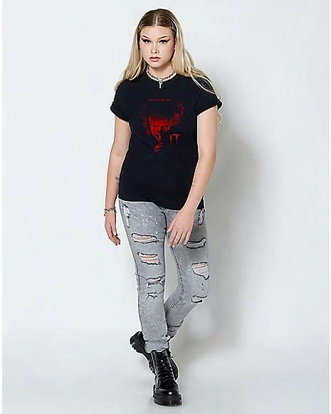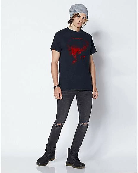 Horror movie fans, put a spooky spin on your casual wardrobe with this black and red official IT Pennywise t shirt! This graphic tee features Pennywise the Clown and is sure to get noticed whenever you wear it.