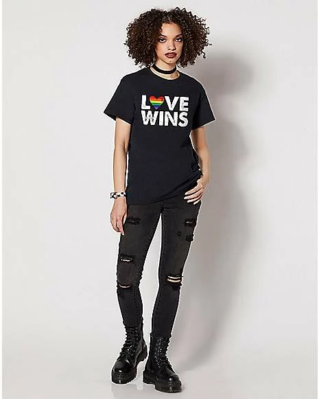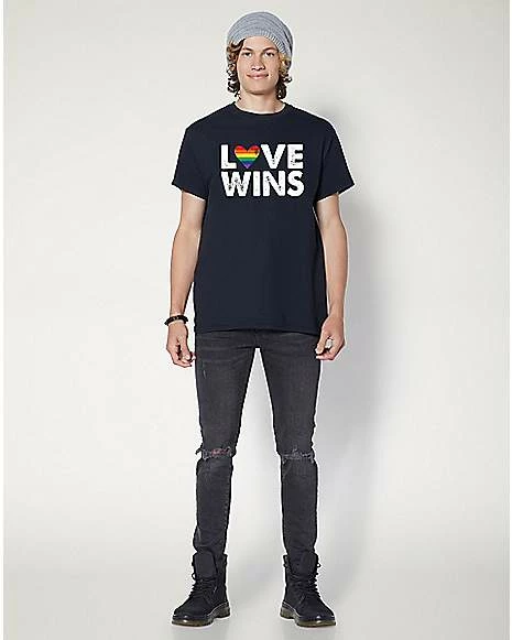 Love always wins. Show off your pride and support with this rainbow heart love wins t shirt.