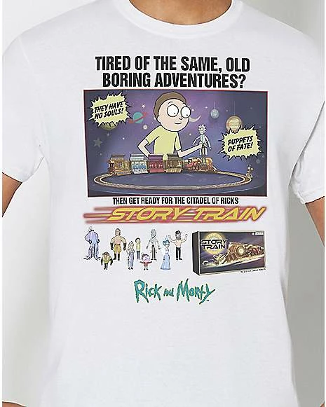 Celebrate one of your favorite TV moments with this official Rick and Morty Retro Story Train t shirt! This fun graphic tee is sure to be popular and become a staple of your everyday wardrobe.