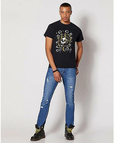 Stay trippy, ya hippie. This stunning black t shirt features a graphic display of roses, mushrooms, and bones in the form of bold white and yellow line art. It doesn’t get much cooler than this.