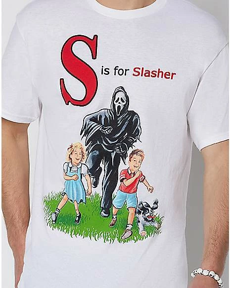 Make everyone laugh when you wear this hilarious Ghost Faceยฎ S Is For Slasher t shirt! This graphic tee the perfect way to mix your love of horror with your sense of humor.