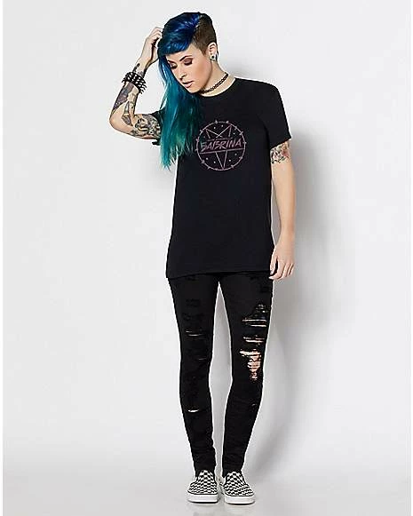 Feelin’ witchy? Add some witch vibes to any outfit when you rock this Sabrina Pentagram T Shirt as part of your look. This stylish pentagram tee is just what any fan of the show needs to show they love getting involved in all kinds of witchy business.