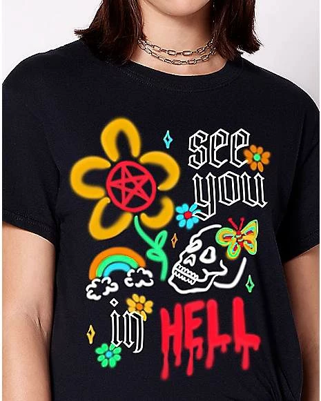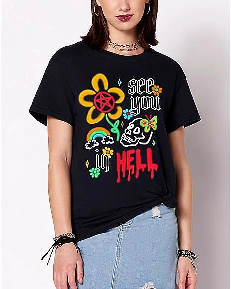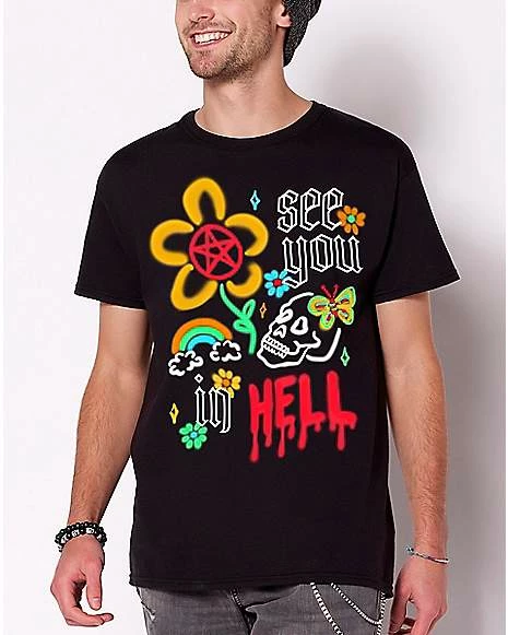 Add some attitude to your casual t shirt collection by rocking this cool See You in Hell T Shirt. This t shirt features a vibrant neon design thatβs sure to brighten up any outfit and youβll be looking stylish wherever you go while wearing it.