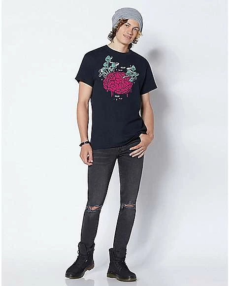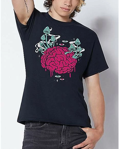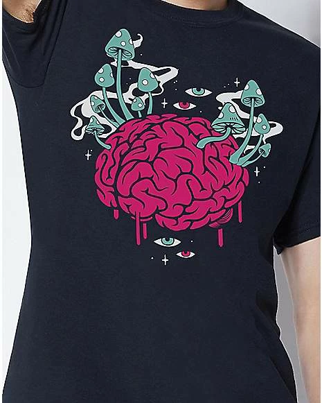 Got shrooms on the brain? This graphic t shirt offers a vibrant illustration of a pink brain topped with blue and white mushrooms. The surreal scene is surrounded by piercing pink and blue eyeballs. Trippy.